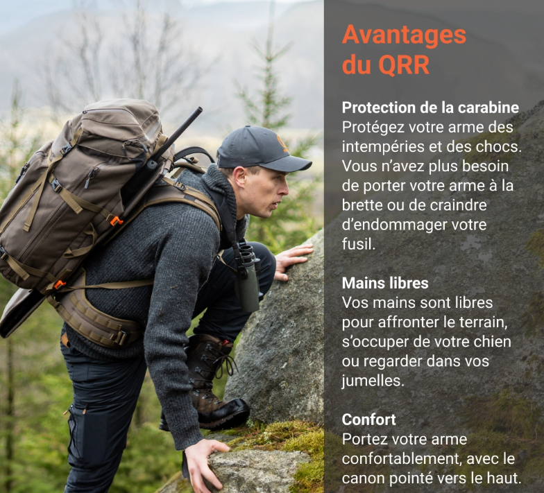 Oui. Le système QRR permet de libérer la carabine en quelques secondes, sans enlever le sac à dos. C'est un avantage majeur en battue ou lors du repérage inattendu du gibier.